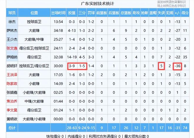 本場(chǎng)胡明軒把籃框砸歪,三分5中1,投籃9中3,還出現(xiàn)了五次失誤,全隊(duì)正負(fù)值最低,在場(chǎng)輸36分。打30分鐘只得8分多嗎?這個(gè)得分真是對(duì)不起那個(gè)600萬(wàn)。杜鋒也迷信胡明軒了,如果讓他休息不打,由徐杰和張文逸來(lái)輪換打一號(hào)位,增加陳家政上場(chǎng)時(shí)間,一定沒(méi)有打得這么丑陋。