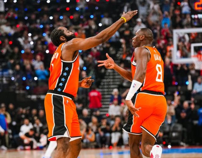 第二節(jié)就掉到44.2%+40.6%,第三節(jié)最差:只有30.5%+18.2%;第四節(jié)有回升:45.5%+41.7%。但具體到第四節(jié)最后3分鐘,效率值也不高:是39.9%+36.8%。還有一個數(shù)據(jù),哈登本賽季受助攻率是25.2%,本賽季打魔術(shù)+勇士+掘金時,全場比賽隊友沒給哈登助攻過,助攻率是0%!從小卡過去6個賽季的表現(xiàn)來看,他很難維持場均38分鐘+場均39分的基本盤,這么打下去,最多1個月,他面臨的傷病困擾是直線增加。而快船的基本盤,則是哈登。當(dāng)小卡最近接連爆發(fā)時,哈登終于不用在常規(guī)賽做快船老大了,但他也不太會打球了。
