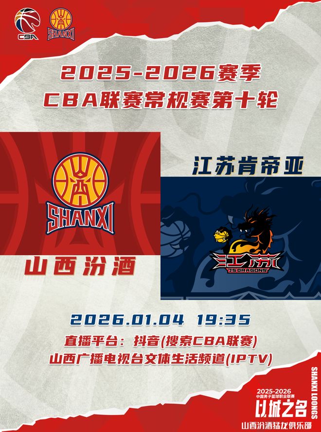 北京時間2026年1月4日19:35,2025-2026賽季CBA聯(lián)賽常規(guī)賽第十輪繼續(xù)進行,山西汾酒繼續(xù)坐鎮(zhèn)主場,迎戰(zhàn)江蘇肯帝亞,球迷觀眾可以通過抖音(搜索CBA聯(lián)賽)、山西廣播電視臺文體生活頻道(IPTV)觀看比賽實況,敬請期待!