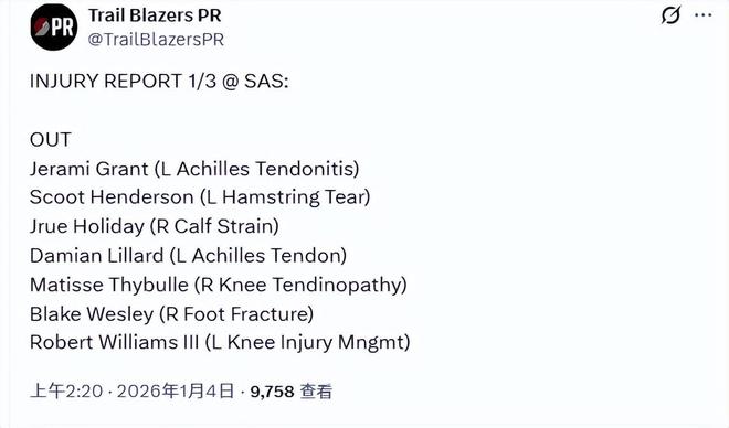 北京時(shí)間1月4日,開(kāi)拓者官方更新了球隊(duì)的傷病報(bào)告。今日背靠背對(duì)馬刺的比賽,格蘭特(左腳跟腱炎)、亨德森(左腿筋撕裂)、霍勒迪(右小腿扭傷)、利拉德(左跟腱傷病)、塞布爾(右膝肌腱炎)、韋斯利(右腳骨折)和羅威(左膝傷病管理)均將缺席。其中,羅威按慣例背靠背缺陣,楊瀚森的機(jī)會(huì)又來(lái)了。
