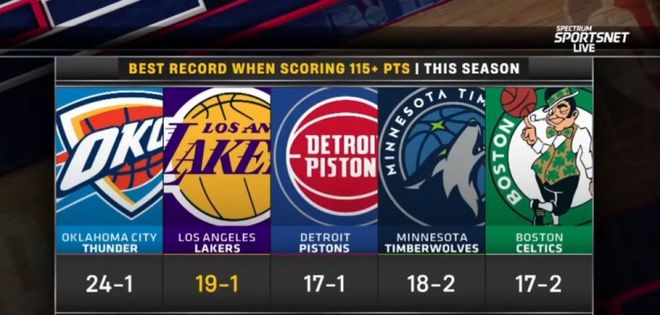 首先,本賽季賽季以來,湖人得分115+球隊(duì)?wèi)?zhàn)績?yōu)?9勝1負(fù),全聯(lián)盟僅次于雷霆。