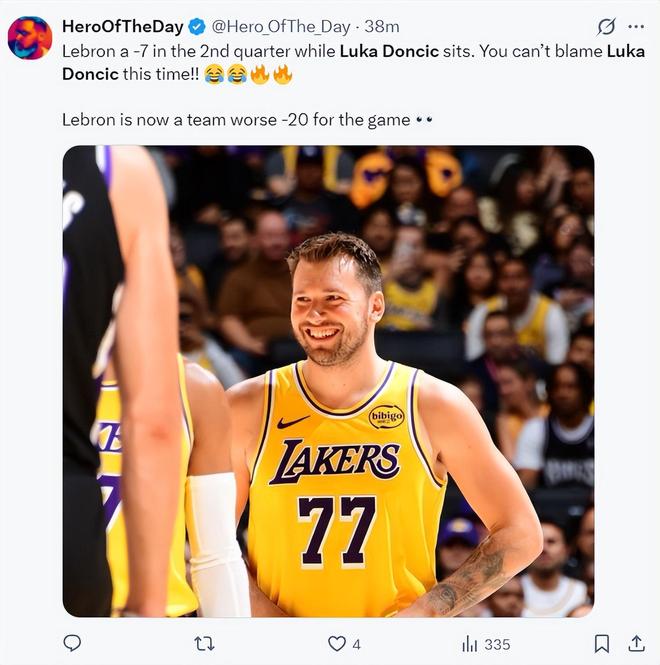 半場打完他繼續(xù)朝詹姆斯開炮:詹姆斯第二節(jié)表現(xiàn)不佳東契奇還在場邊坐著,這一次你們不能怪盧卡了吧?詹姆斯在場時湖人-20分。