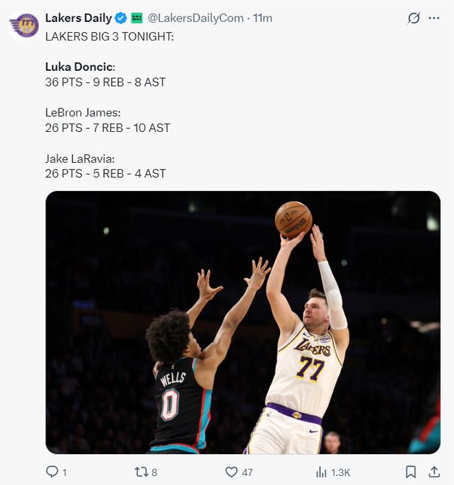 詹黑媒體HOTD不是說Lakers Daily從來不發(fā)東契奇相關(guān)的推文嗎?賽后立馬被打臉,東契奇36+9+8,詹姆斯26+10+7,拉拉維亞26+5+4,這不是關(guān)于東契奇的嗎?