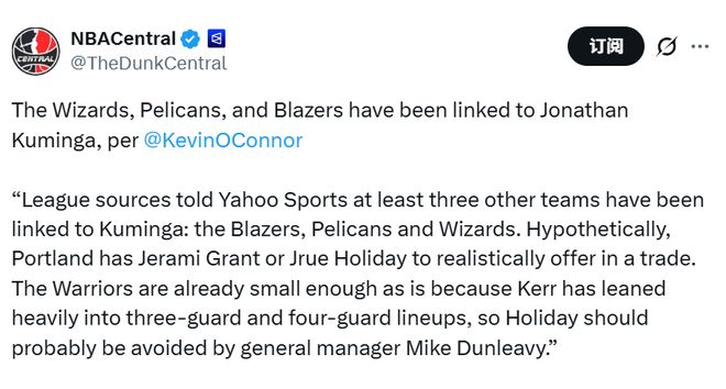 雅虎體育援引聯(lián)盟消息人士的話稱,至少還有三支球隊(duì)正在追逐庫明加,分別是開拓者、鵜鶘和奇才。以下是雅虎體育的報(bào)道——