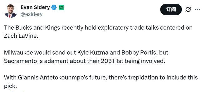 在初步提出的交易框架中,雄鹿隊計劃將凱爾-庫茲馬與博比-波蒂斯送至國王隊。不過有消息稱,國王隊立場強硬,堅持要求雄鹿隊將2031年的首輪簽納入交易籌碼。考慮到字母哥的長期去向尚未明朗,雄鹿隊對于送出這個選秀權(quán)一事十分猶豫。