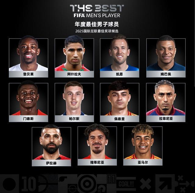 11月7日,FIFA國(guó)際足聯(lián)公布了2025年年度最佳男子球員的11人候選名單。登貝萊、姆巴佩、亞馬爾、凱恩等人在列,曼城哈蘭德則無(wú)緣入選。